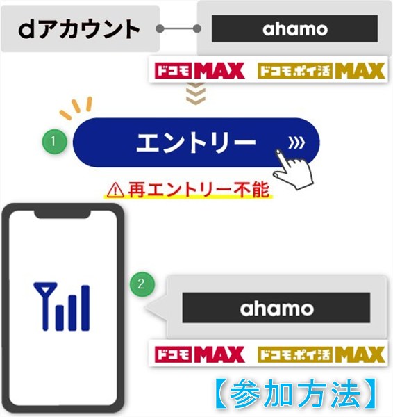 | ステップ1 | 「ahamo」に紐づいている 「dアカウント」でエントリー | 「ドコモ MAX」または「ドコモ ポイ活 MAX」 に紐づいている 「dアカウント」でエントリー |