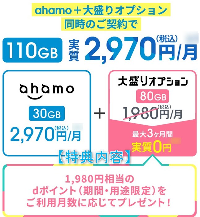 「ahamo(アハモ)」の「大盛りオプション」が実質無料で利用出来るキャンペーン期間があるとの事なので、