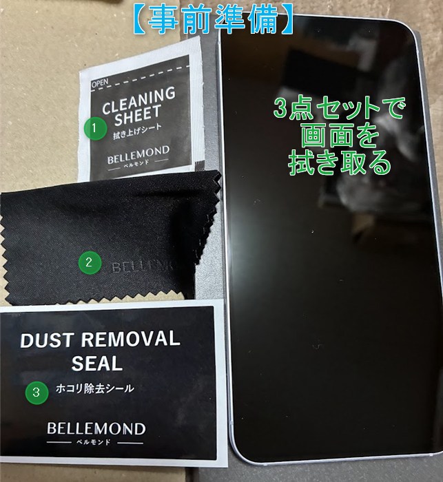 事前準備としてガラスフィルムを貼り付ける前に、本製品に付属されている3点セットでスマホ画面をキレイに拭き取り・ホコリを除去しておきましょう。