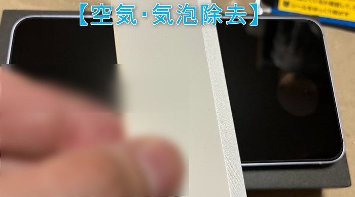 上記画像のガイド枠を取り外した後で、ヘラ状の付属品を使用して空気や気泡を押し出しましょう。