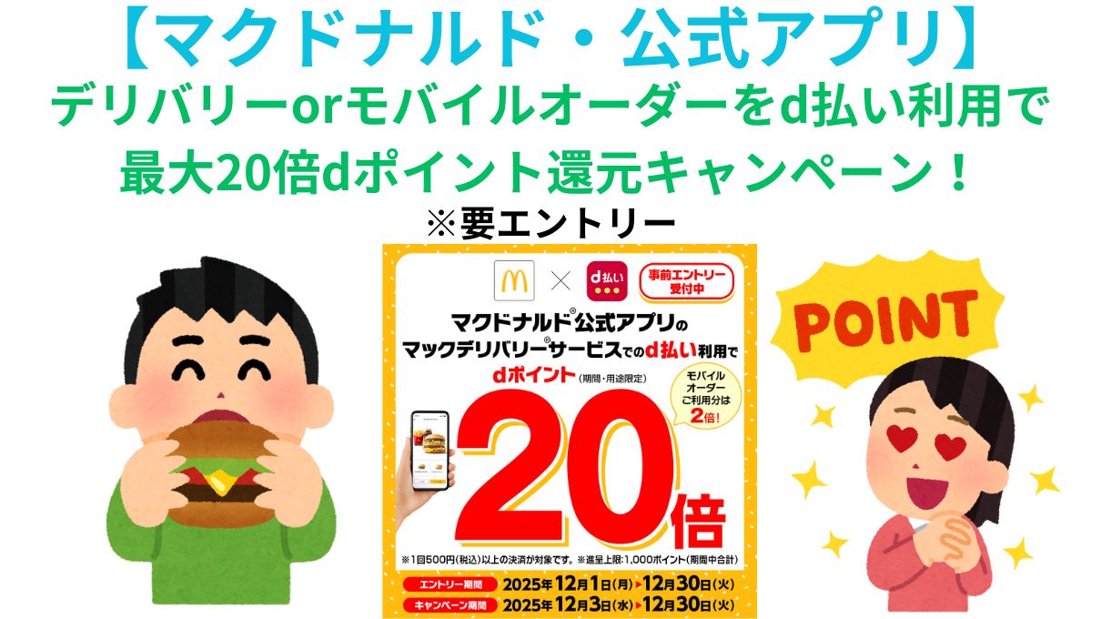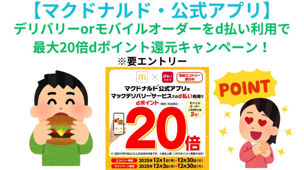 - 【マクドナルド公式アプリ+d払い】税込500円以上/回の会計で最大20倍のdポイント還元あり!