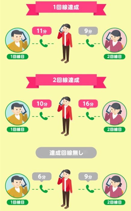 【達成回線なし】2回線の合計通話時間が10分以上の場合でも達成なしとなります。
