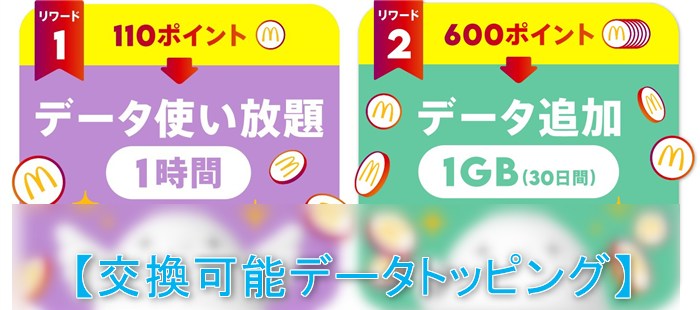 「Myマクドナルド リワード」を利用して貯まったポイントで、「povo 2.0」にて以下の2種類のデータトッピングと期間限定で交換する事が出来るようになっています。
