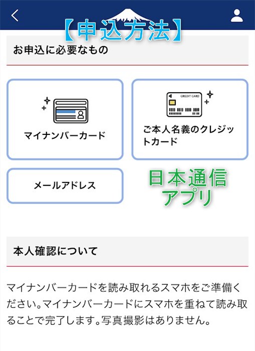 本サービスへのお申し込み方法ですが、「日本通信アプリ」と「マイナンバーカード」で本人確認して手続きを進めましょう。