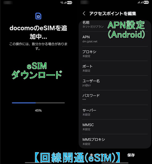 本サービスのeSIM回線を開通させるためには、「eSIMのダウンロード」および「アクティベート」を済ませます。