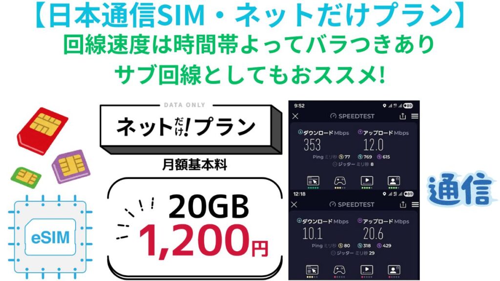 【ネットだけプラン】回線速度は時間帯よってバラつきがあるがサブ回線としてもおススメな日本通信SIMのデータ専用版!