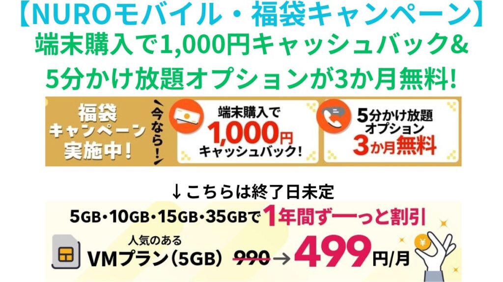 【NUROモバイル】端末購入で千円キャッシュバック&5分かけ放題OPが3か月無料の福袋キャンペーンとは?