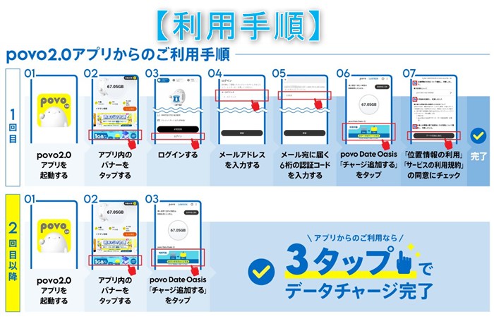 「povo 2.0アプリ」からの利用手順ですが、1回目のみは7ステップでのデータチャージ操作をする必要があります。