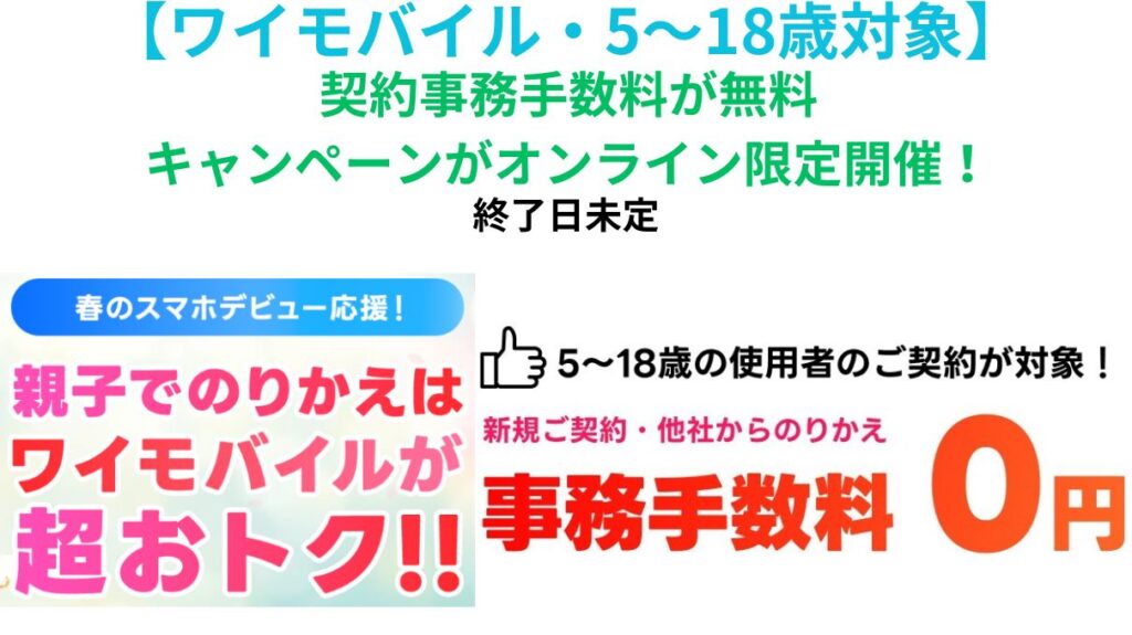 Y!mobile(ワイモバイル)」より、「【U18限定】事務手数料無料キャンペーン」という名称で終了日未定のキャンペーンに関する記事でした。